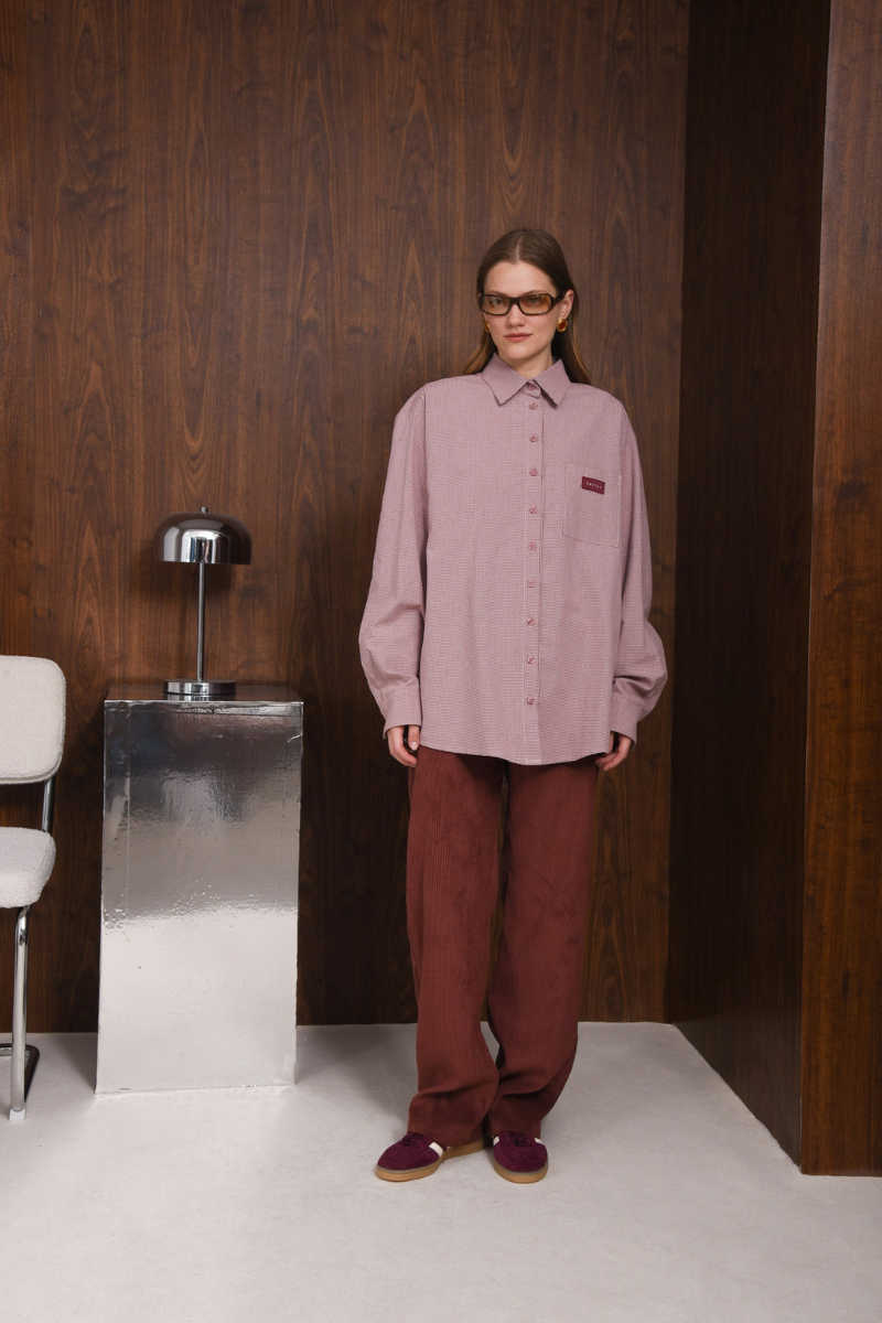Πουκάμισο Grace, ένα oversized βαμβακερό πουκάμισο σε σκούρο ροζ μοτίβο με μικρο-καρό. Σχεδιασμένο με μυτερό γιακά, κουμπιά σε τόνους και τσέπη στο στήθος με μπορντό έμπλαστρο με το λογότυπο “ARPYES”. Χαλαρή σιλουέτα με πτυχωτή πλάτη για άνεση και κίνηση.