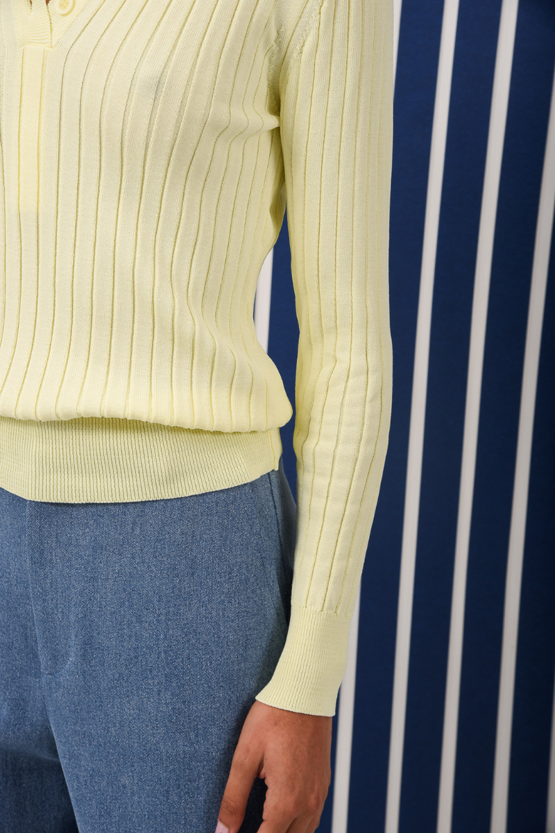 Ένα εφαρμοστό, πλεκτό πόλο με ριμπ ύφανση, κατασκευασμένο από απαλό, ελαστικό ύφασμα για μια κολακευτική, δομημένη σιλουέτα. Σχεδιασμένο με κλασικό γιακά πόλο, πατιλέτα με κουμπιά και μακριά μανίκια με ριμπ ύφανση στις μανσέτες και το στρίφωμα. Καθαρό και ευέλικτο, συνδυάζει εκλεπτυσμένη ραφή με καθημερινή άνεση για αβίαστο στυλ.
