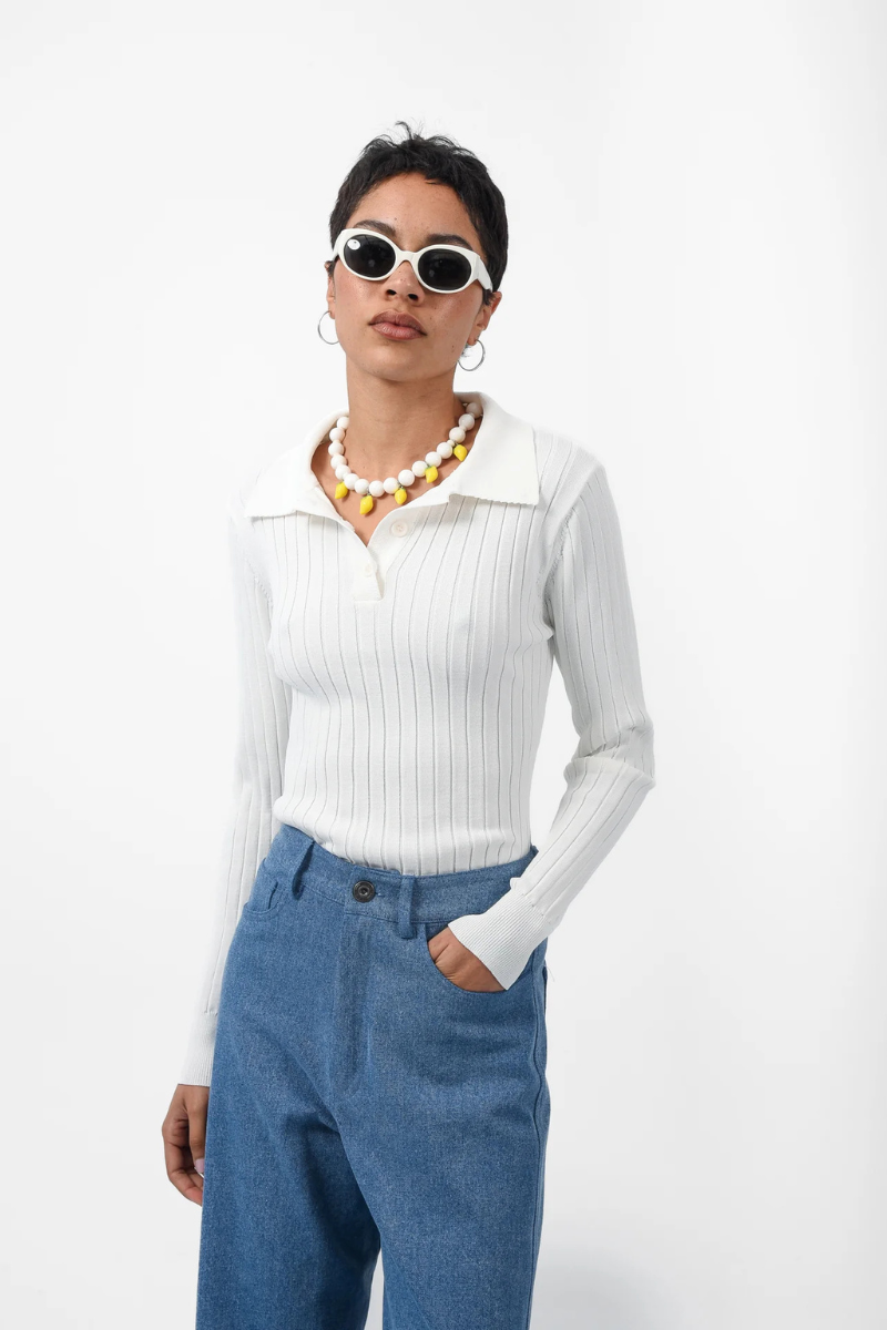 Ένα εφαρμοστό, πλεκτό πόλο με ριμπ ύφανση, κατασκευασμένο από απαλό, ελαστικό ύφασμα για μια κολακευτική, δομημένη σιλουέτα. Σχεδιασμένο με κλασικό γιακά πόλο, πατιλέτα με κουμπιά και μακριά μανίκια με ριμπ ύφανση στις μανσέτες και το στρίφωμα. Καθαρό και ευέλικτο, συνδυάζει εκλεπτυσμένη ραφή με καθημερινή άνεση για αβίαστο στυλ.