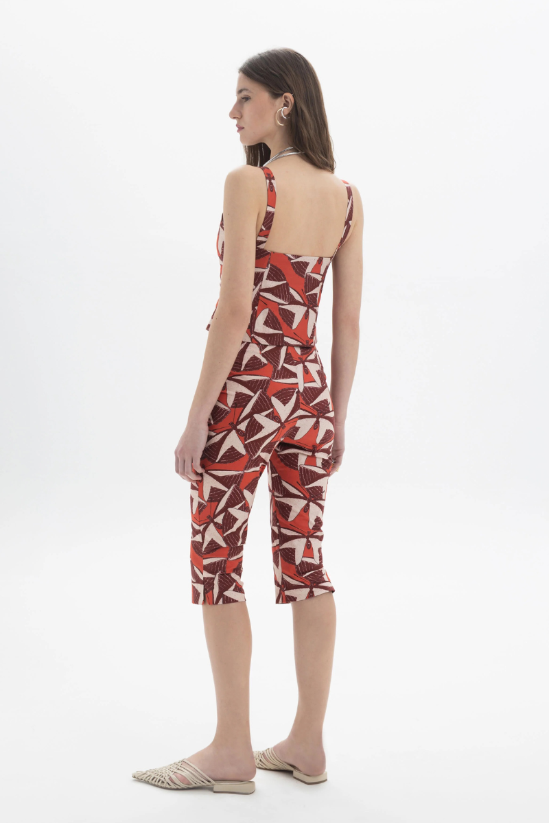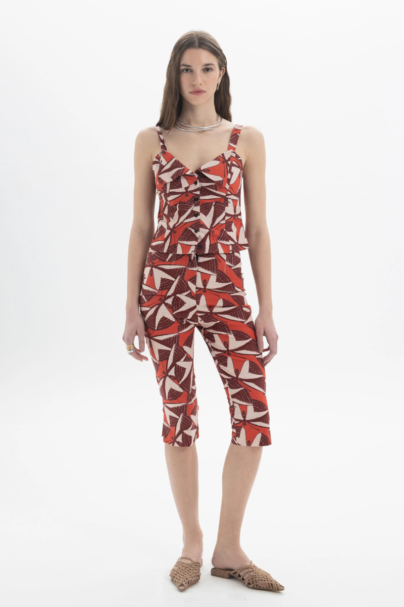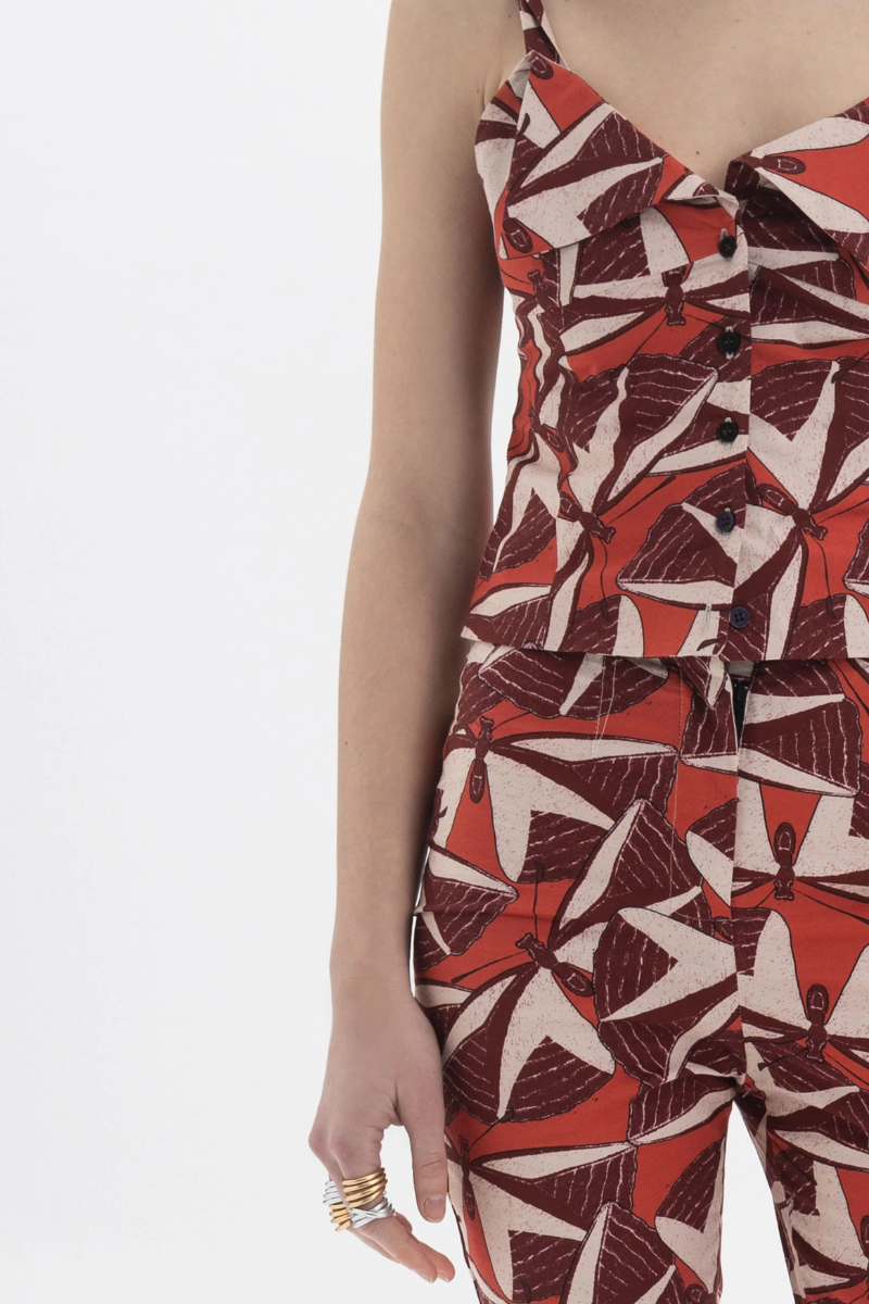 Εφαρμοστό τοπ σε σχήμα καμί με τιράντες και V λαιμόκοψη. Σχεδιασμένο με λεπτομέρεια με κουμπιά μπροστά και γραφικό τύπωμα σε όλη την επιφάνεια για μια τολμηρή καλοκαιρινή εμφάνιση.