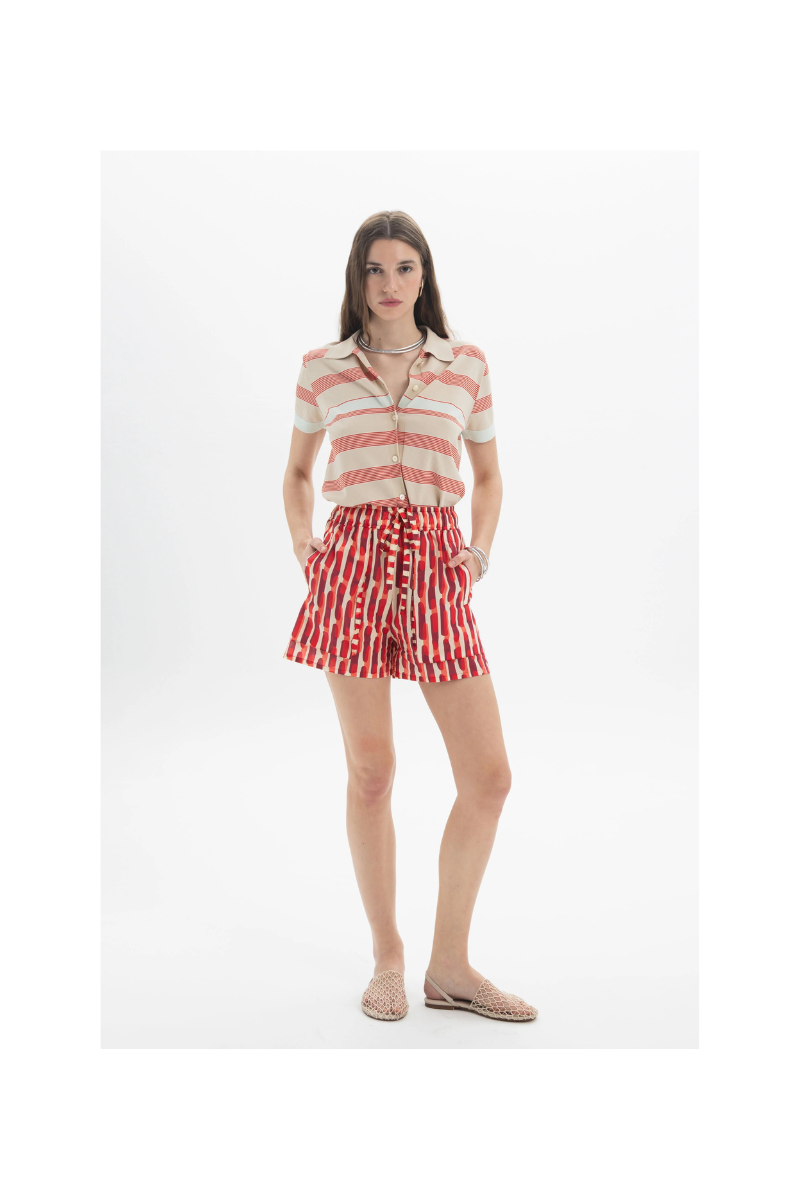Πλεκτό πόλο με κοντό μανίκι και απαλό γιακά και κλείσιμο με κουμπιά μπροστά. Σχεδιασμένο με χαλαρή σιλουέτα και οριζόντιο μοτίβο με ρίγες που προσθέτει μια γραφική πινελιά. Το ελαφρύ πλεκτό ύφασμα προσφέρει άνεση και μια αβίαστη καθημερινή εμφάνιση.