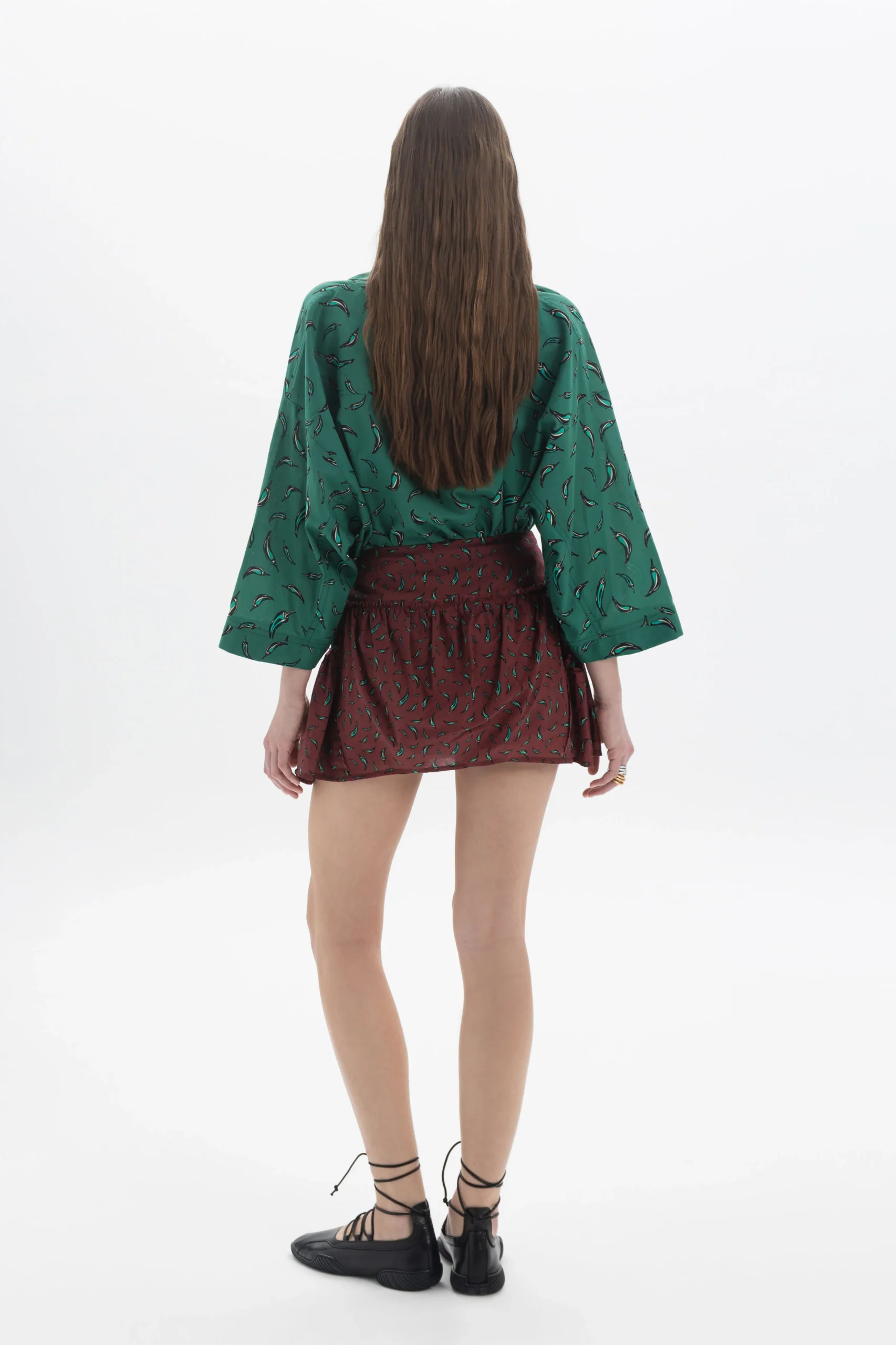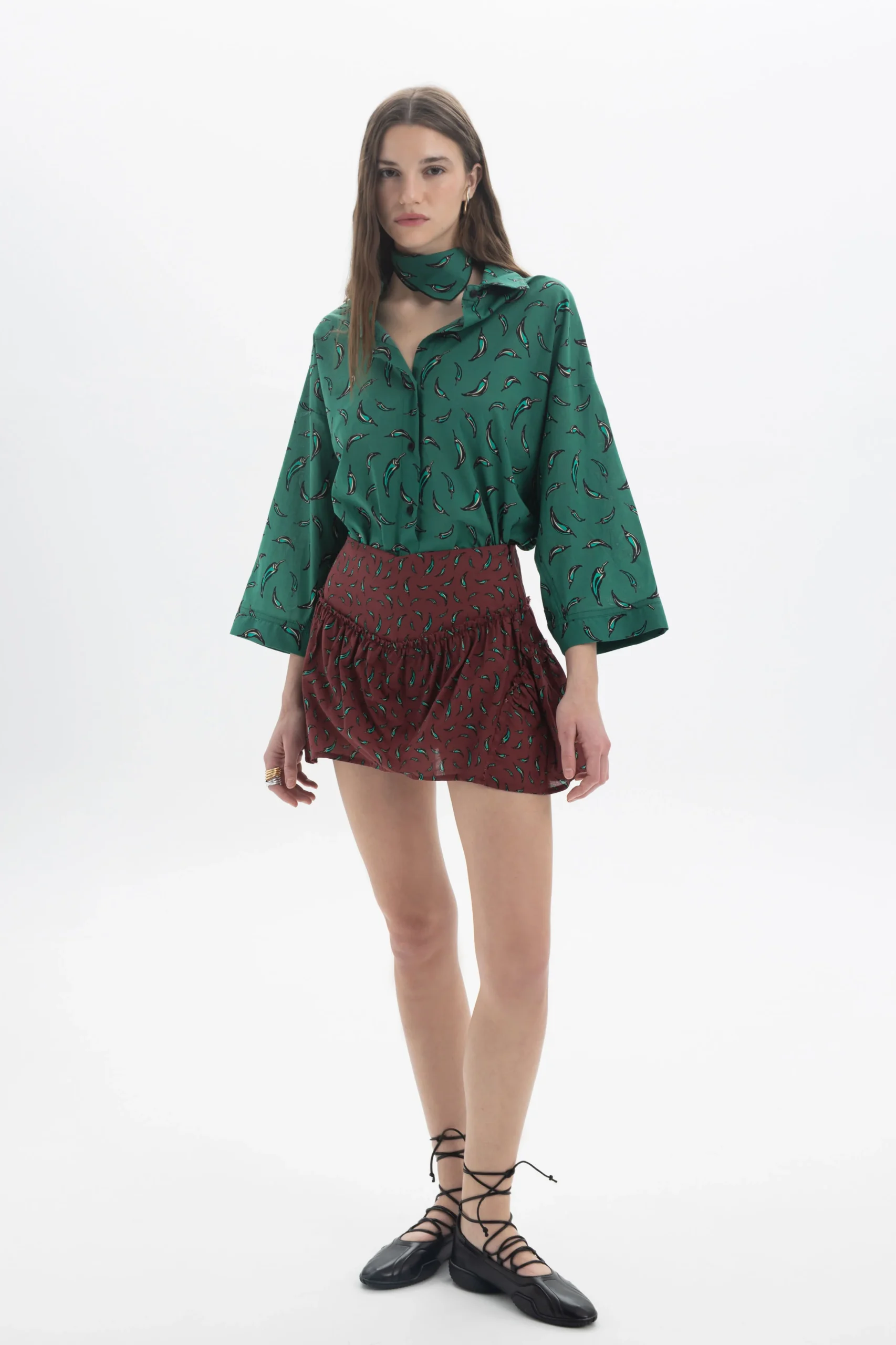 Χαλαρό πουκάμισο με κουμπιά μπροστά, print all over, κλασικό γιακά και φαρδιά μανίκια τριών τετάρτων. Η ρευστή σιλουέτα και το απαλό ντραπέ δημιουργούν ένα αβίαστο, εύκολο στο ντύσιμο κομμάτι που μπορεί να φορεθεί είτε μέσα είτε χαλαρά.