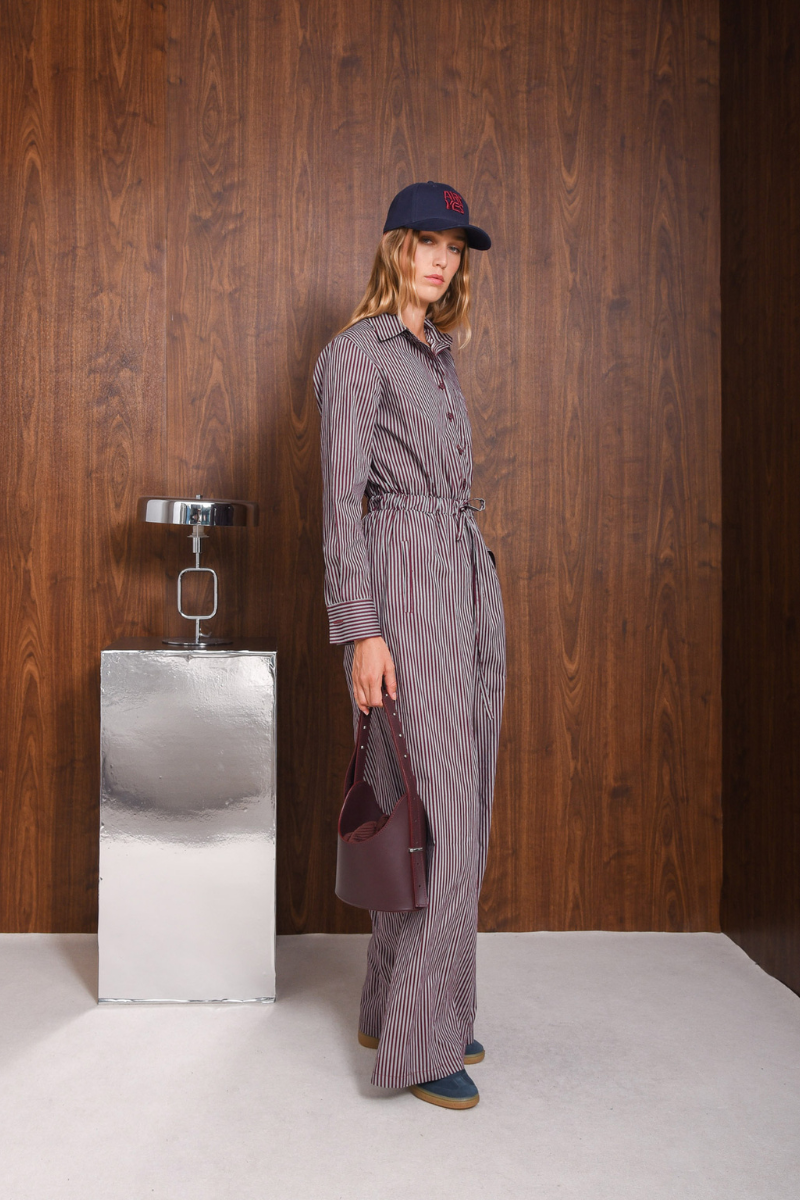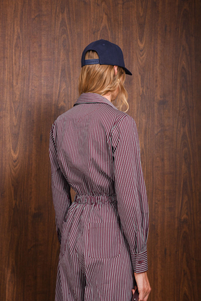 The Aura Jumpsuit is a relaxed, striped one-piece with long sleeves, a pointed collar, and a button-down front. A drawstring waist adds shape, while side and back pockets bring functionality. Finished with buttoned cuffs and wide legs, it balances comfort and style effortlessly.