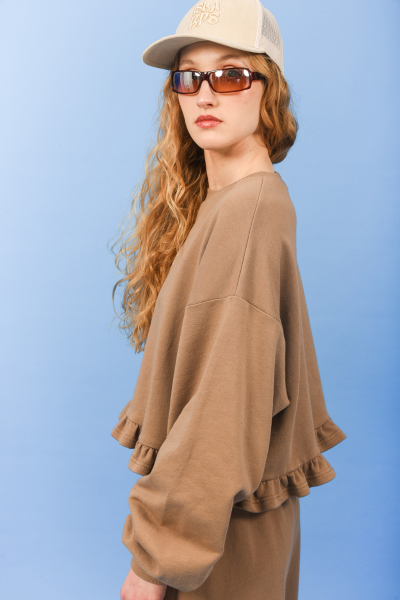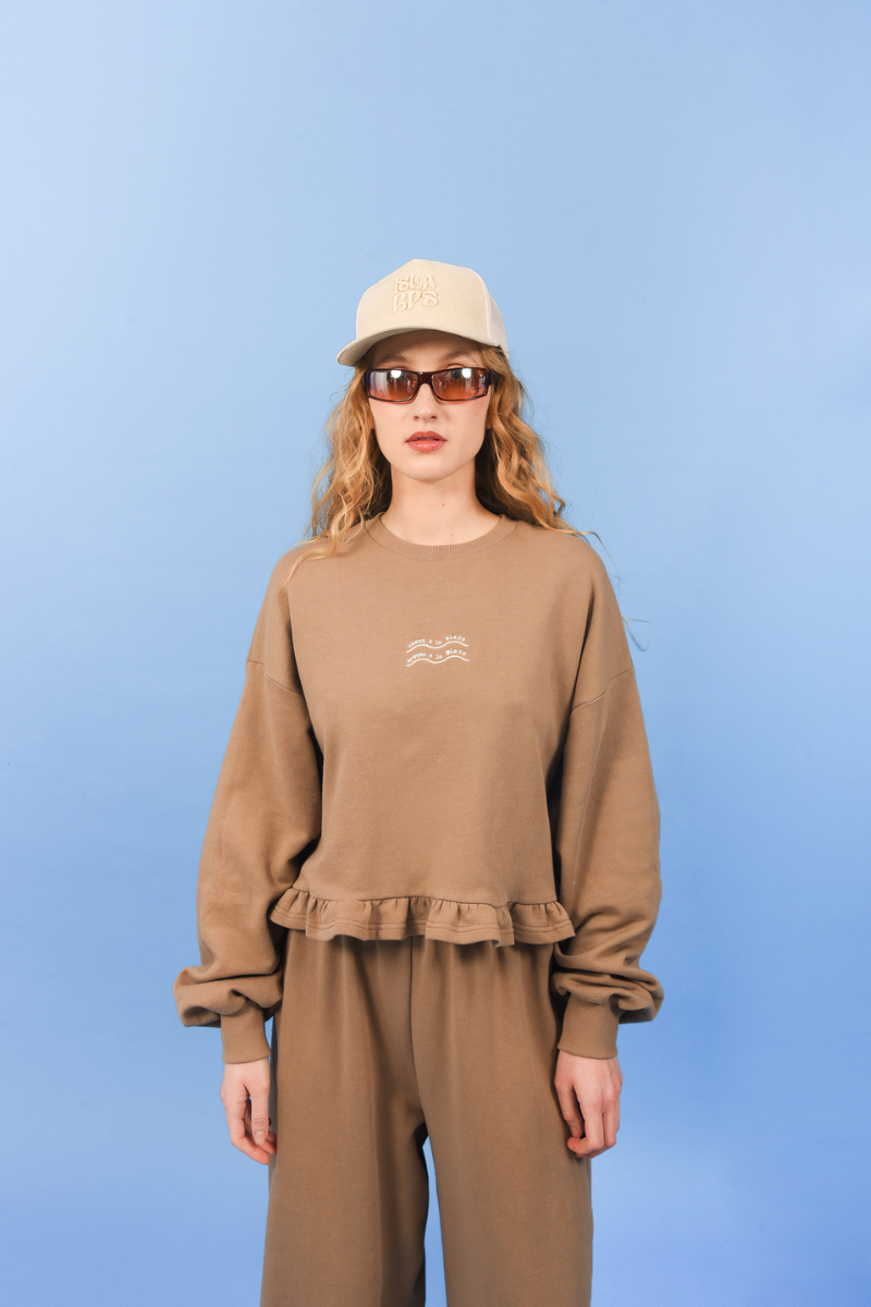 The Easy Living Sweater is designed for effortless comfort with a relaxed, oversized silhouette. Crafted from soft, cozy fabric, it features dropped shoulders, voluminous sleeves, and a cropped length finished with a playful ruffled hem. The minimalist chest embroidery adds a subtle signature detail, making it an easy everyday piece that blends laid-back ease with a feminine touch.