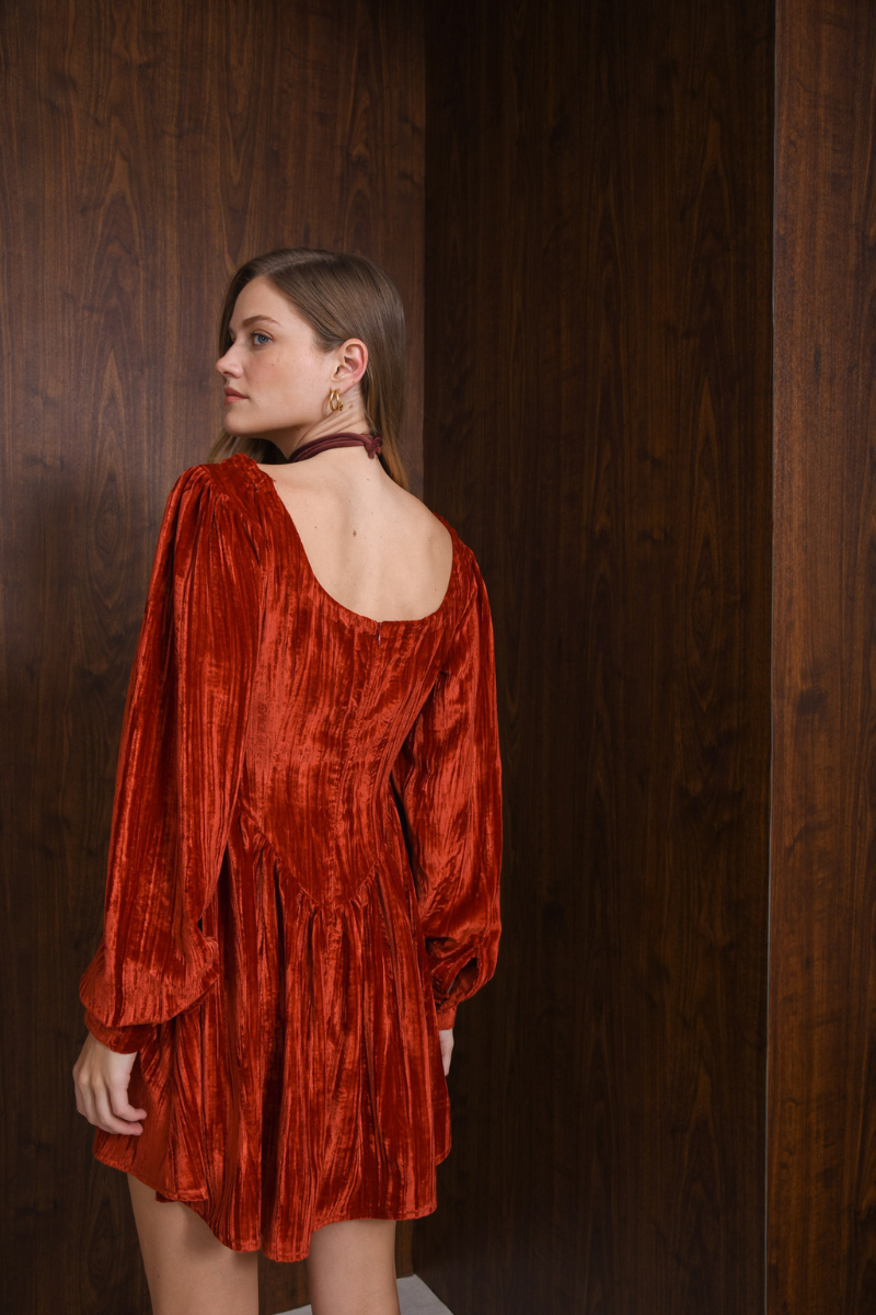 The Fearless Mini Dress is made from soft fabric with a velvet finish, rich texture and natural shine. It features a square neckline with a small tie detail, long puffed sleeves with buttoned cuffs, and a fitted waist that flows into a flared skirt. A flattering and elegant choice for any occassion.