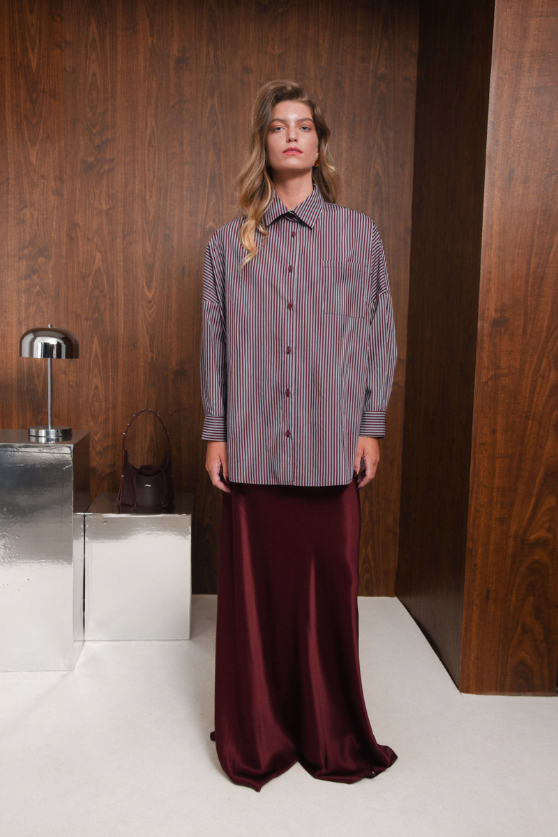 The Aura Shirt is designed in burgundy and white stripes and features a relaxed oversized fit, pointed collar, chest pocket, and long sleeves with buttoned cuffs. Its straight hem and classic button-down front make it versatile to style it in multiple ways.