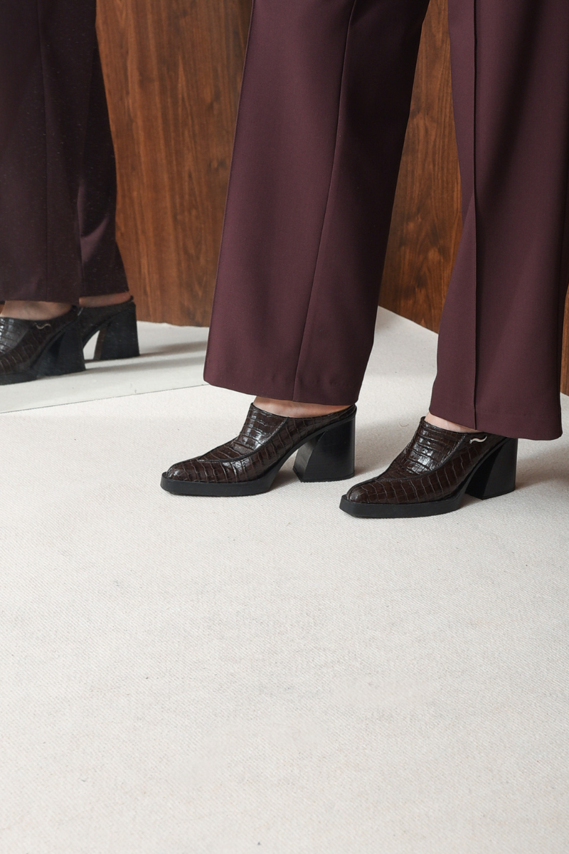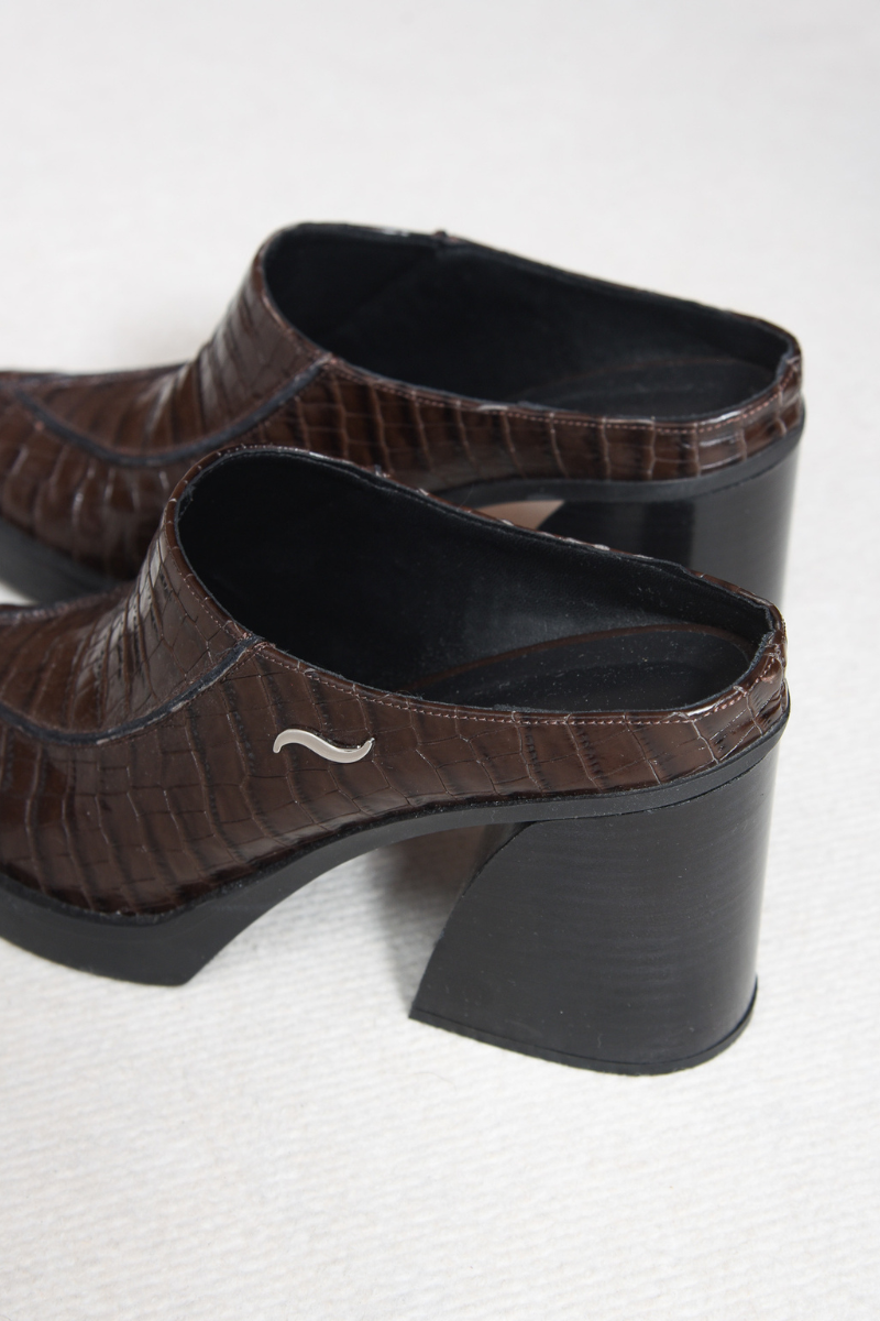 The Exist cowboy mule is crafted in brown croc-embossed leather with a sleek pointed toe. Designed with an open back, slip-on style, and a chunky block heel for comfort and stability. Finished with a silver metal logo detail on the side, it blends western attitude with modern elegance.