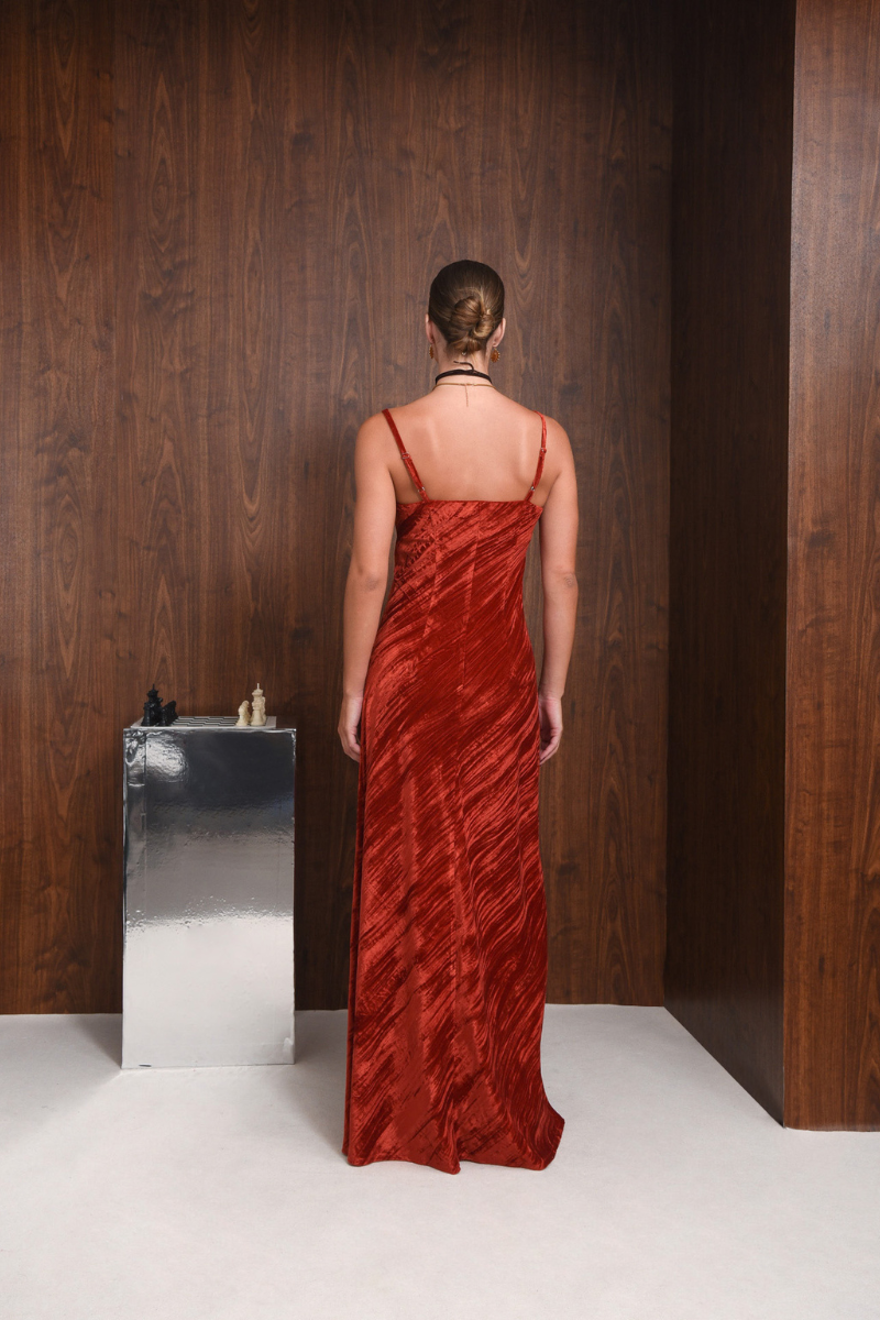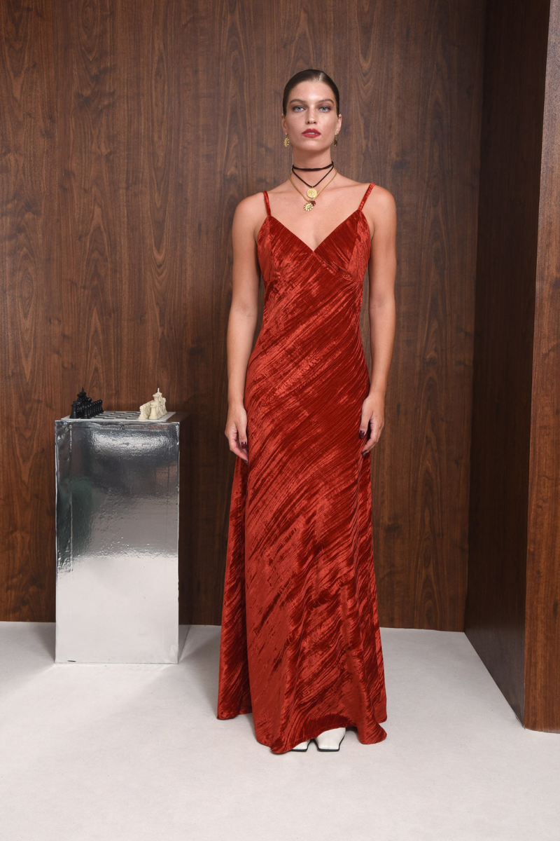 Fearless Maxi Dress, a long dress made from soft fabric with velvet finish, rich texture and natural shine. It features a flattering V-neckline, thin adjustable straps, and a bias-cut design that follows the body’s shape. The floor-length silhouette flows smoothly, creating an elegant and timeless look.