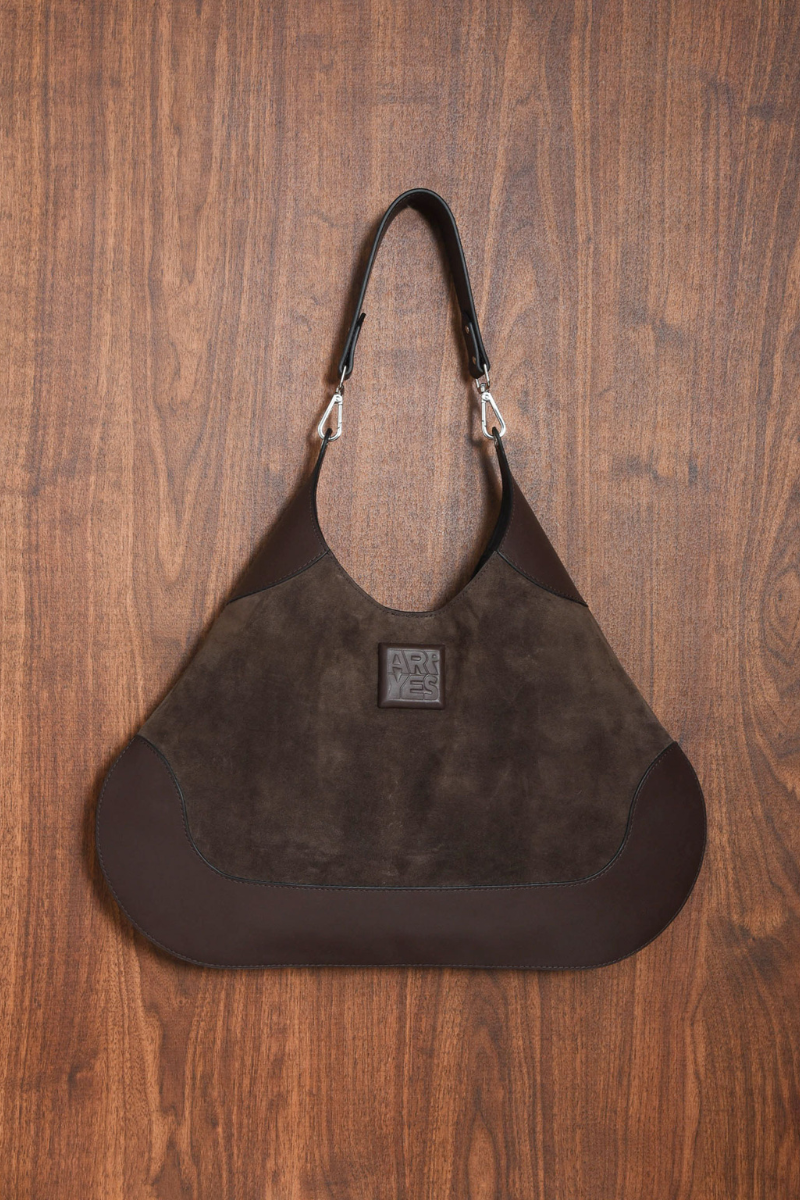 The Satisfaction Bag is crafted from soft brown suede with smooth leather trim. It features a rounded, sculptural shape, detachable leather strap with silver hardware, and embossed ARRÊYÉS logo on the front. Spacious and lightweight, it combines elegance and practicality — perfect for everyday wear with a refined, modern touch.