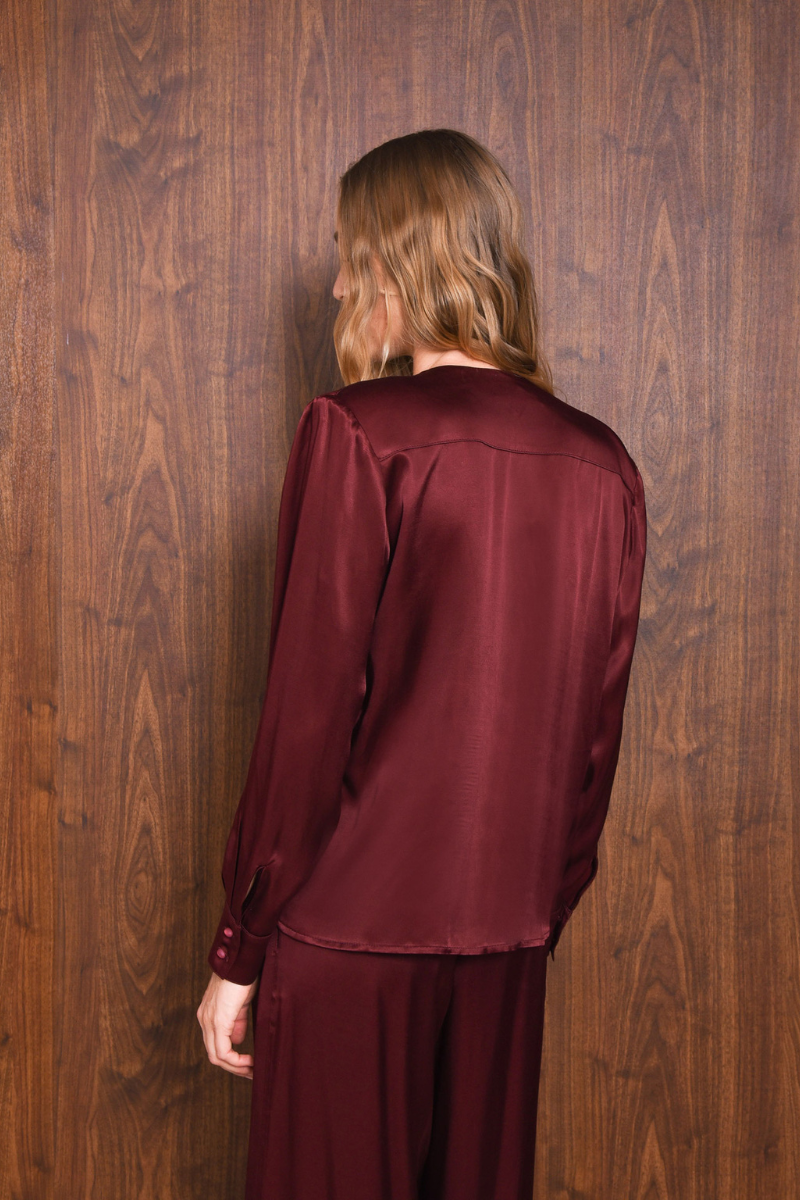 The Vanity Shirt is a soft, silky blouse with a wrap-effect front and deep V-neckline. It features long sleeves with tailored cuffs, subtle shoulder gathers, and a clean closure. Its fluid fabric drapes beautifully, offering an elegant, effortless fit—perfect for pairing with wide-leg trousers or styling for evening looks.