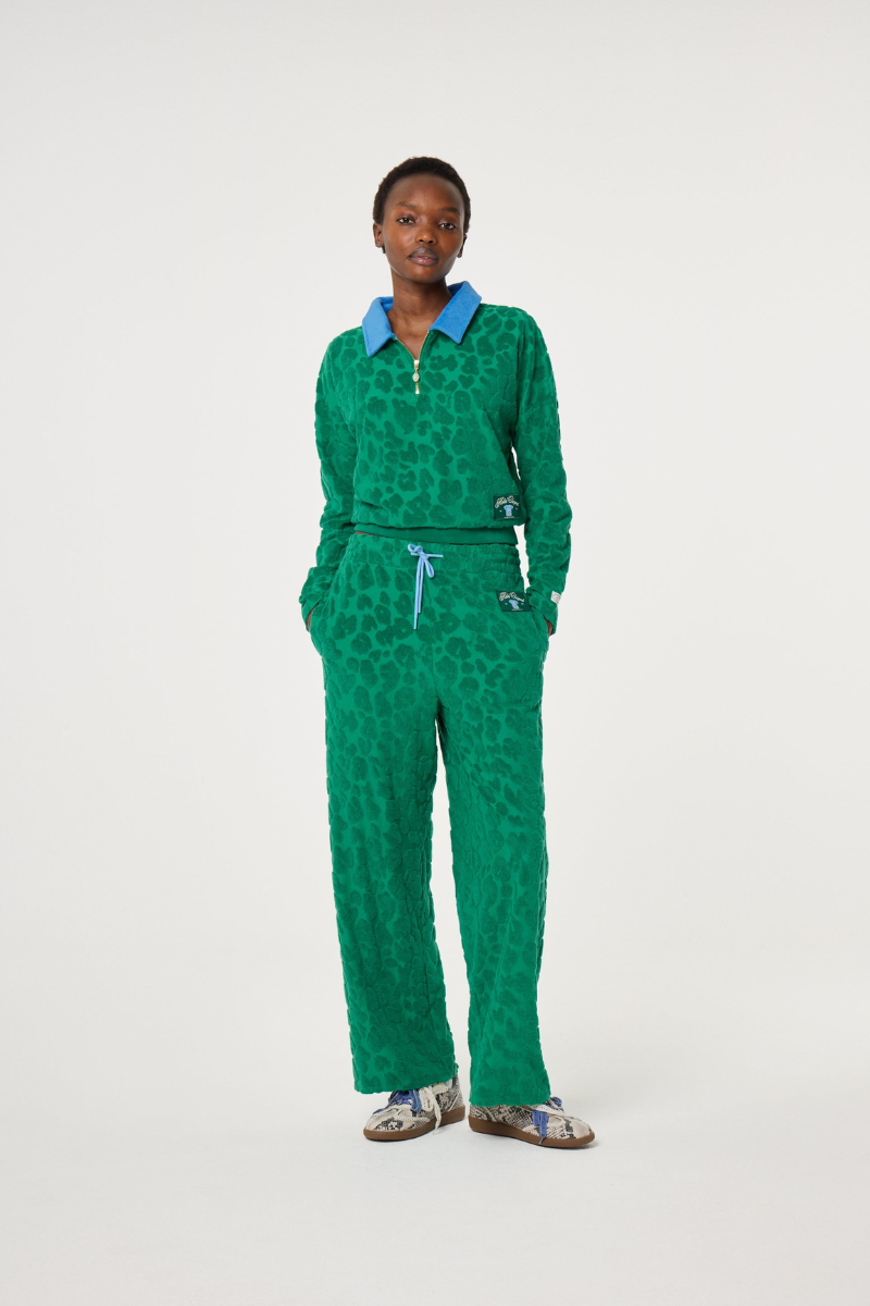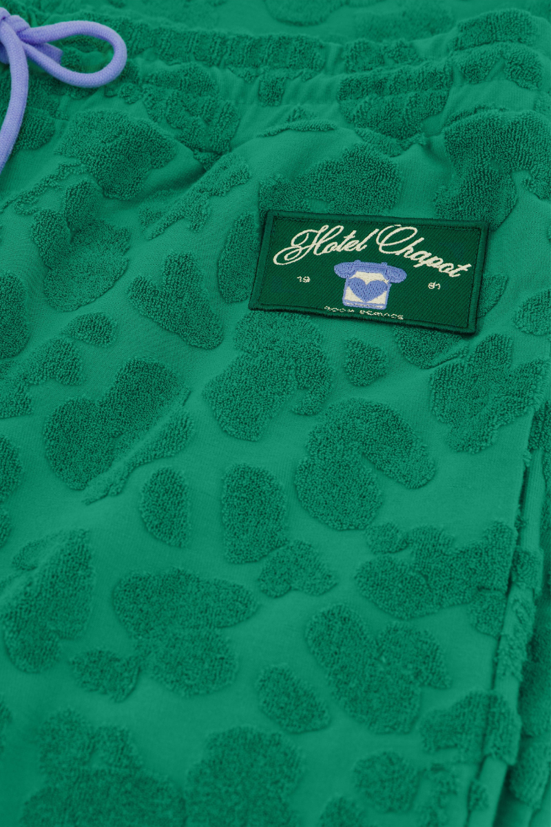 These green trousers feature a textured animal print. The design is finished with a comfortable elasticated waistband, a contrasting purple drawstring, and a playful “Hotel Chapot” patch for a sporty look. Pair these trousers with a simple white top for a modern look, or style them with a casual T-shirt for a relaxed summer outfit.