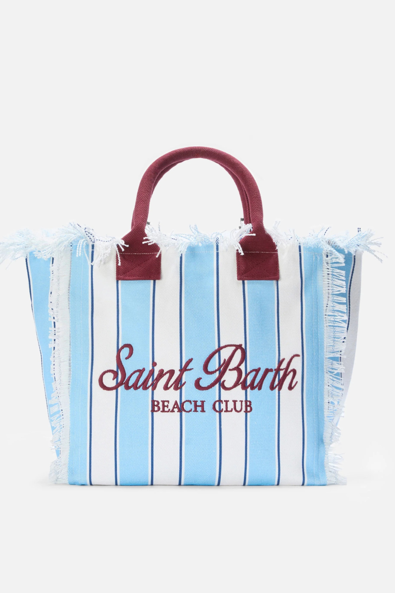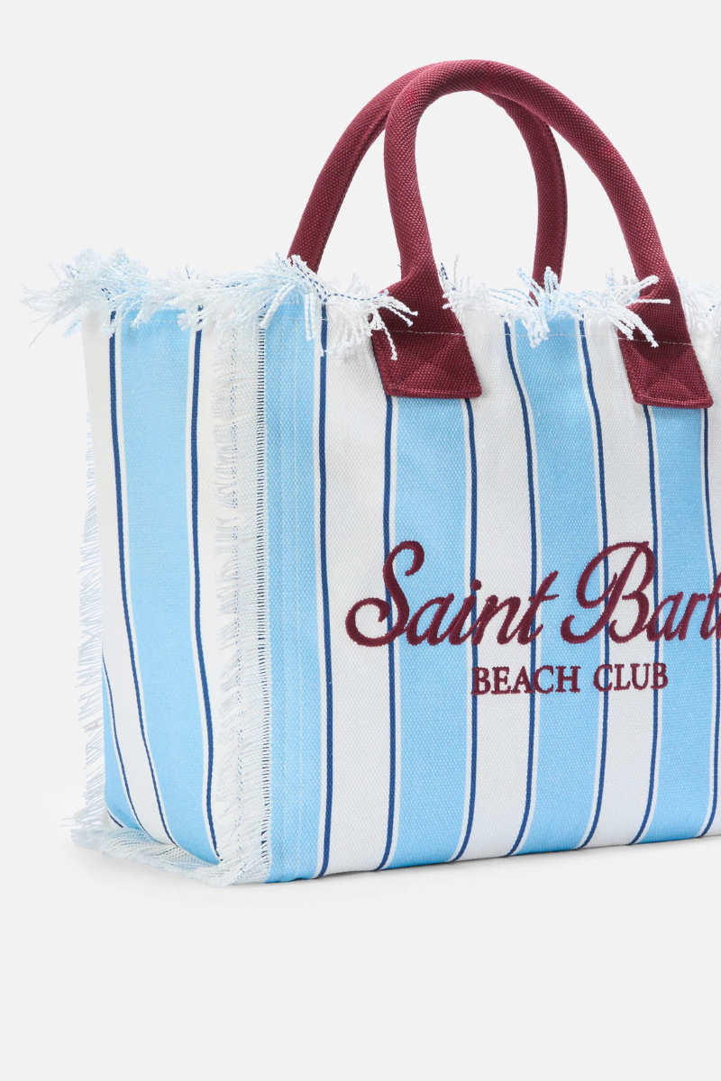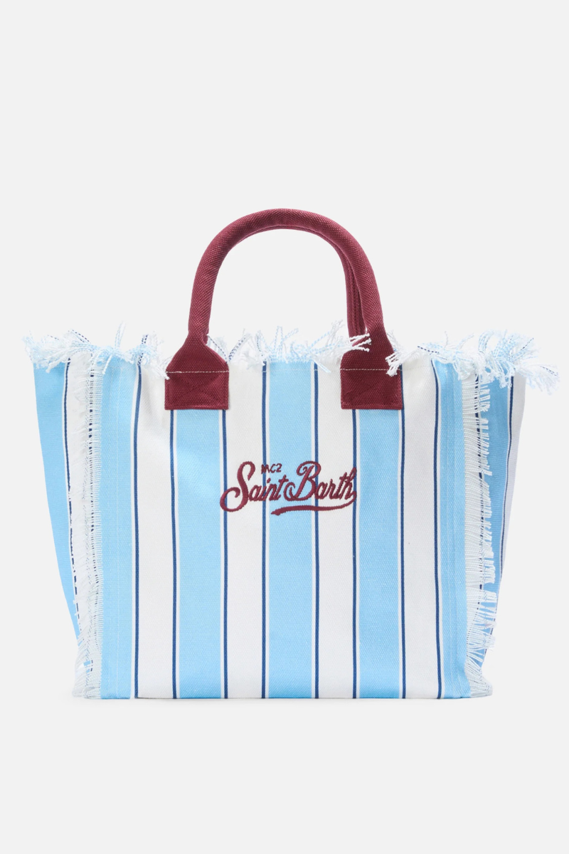 The regular Vanity bag is crafted in canvas with a soft-structured silhouette and light blue and white vertical stripe pattern with contrasting bordeaux details. Side and top fringes add movement, while the embroidered logo on the front enhances the design with a distinctive textured detail. Spacious and practical, it features a top zip closure and an internal pocket to keep essentials organized.