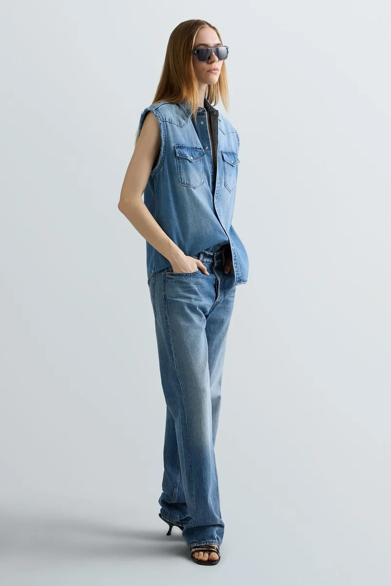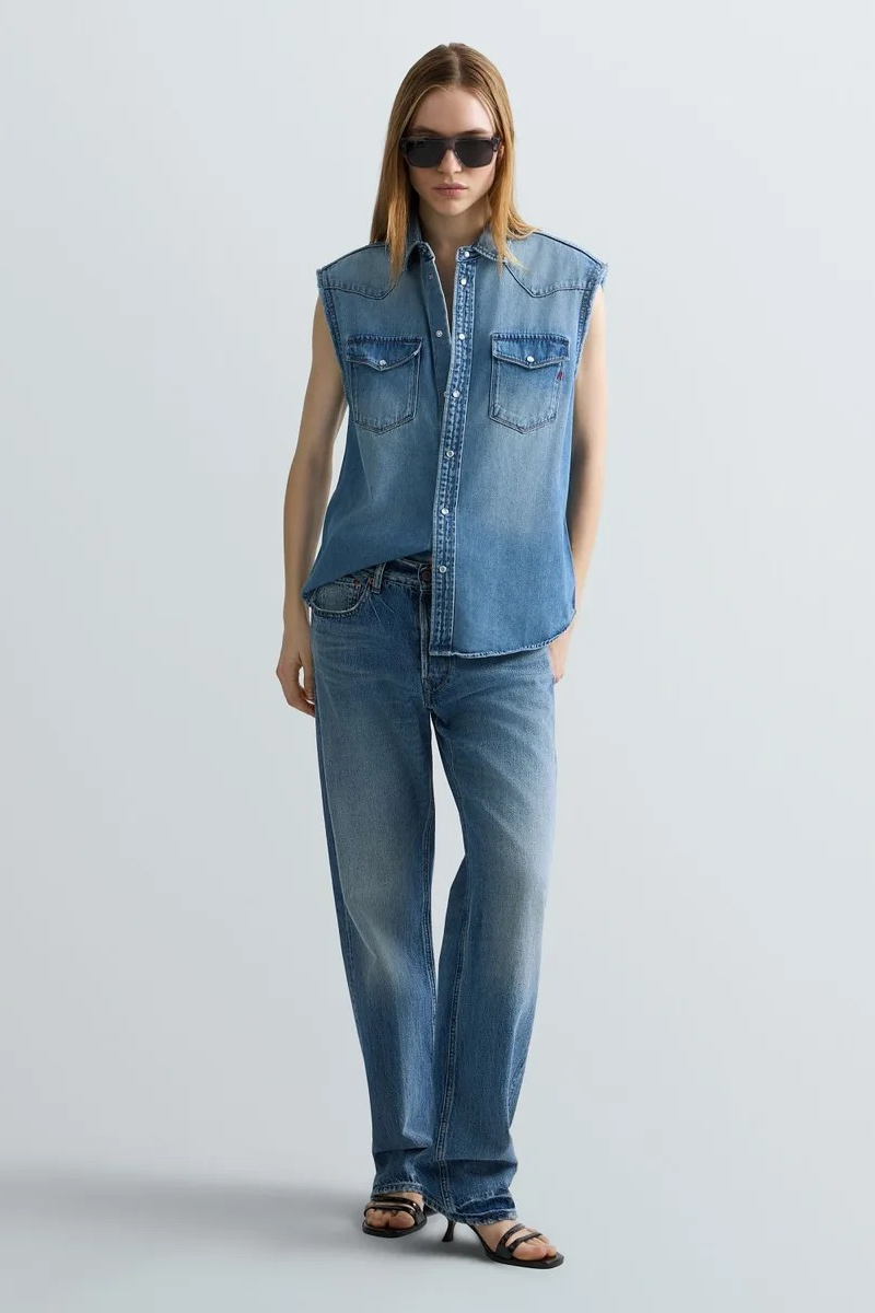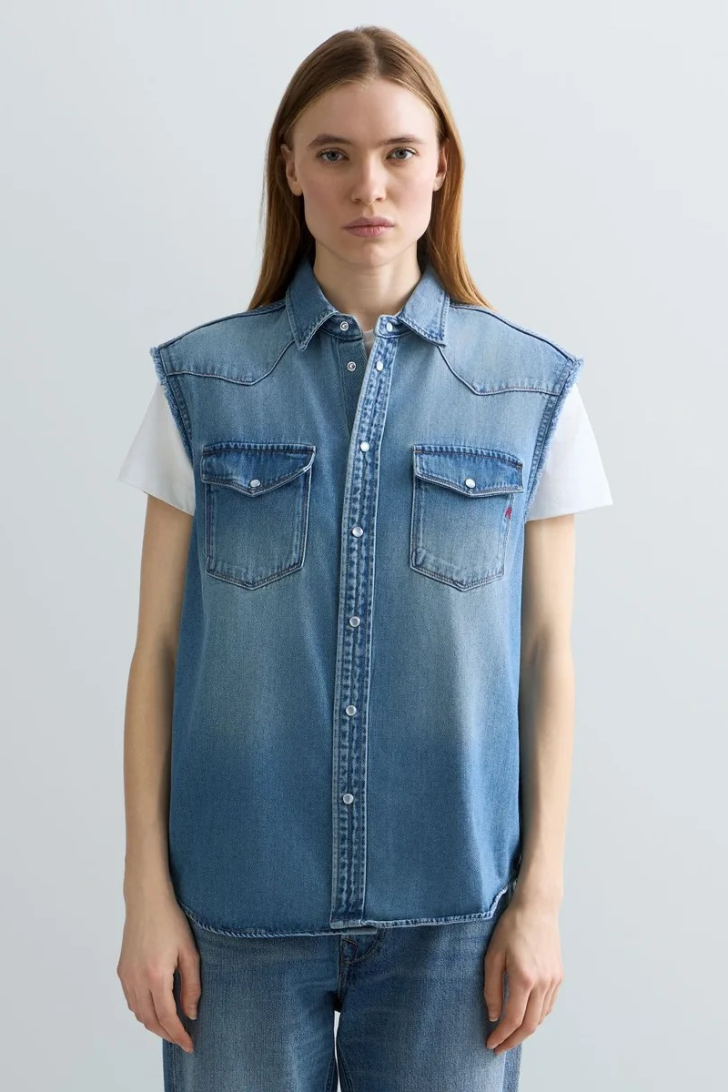Sleeveless oversized shirt in light 9.5-oz cotton and viscose indigo denim with a mid wash. This style features a stone wash with pumice stone and enzymes, and hand-made scratches that creates strong colour contrast on the areas of greatest wear. This piece features a front fastening with press-studs, two top pockets with flap and button on the front and large raw-cut armholes. The R embroidery on one of the front pockets and the western-inspired yoke complete the design.