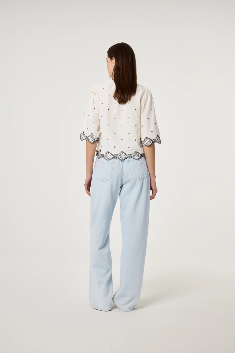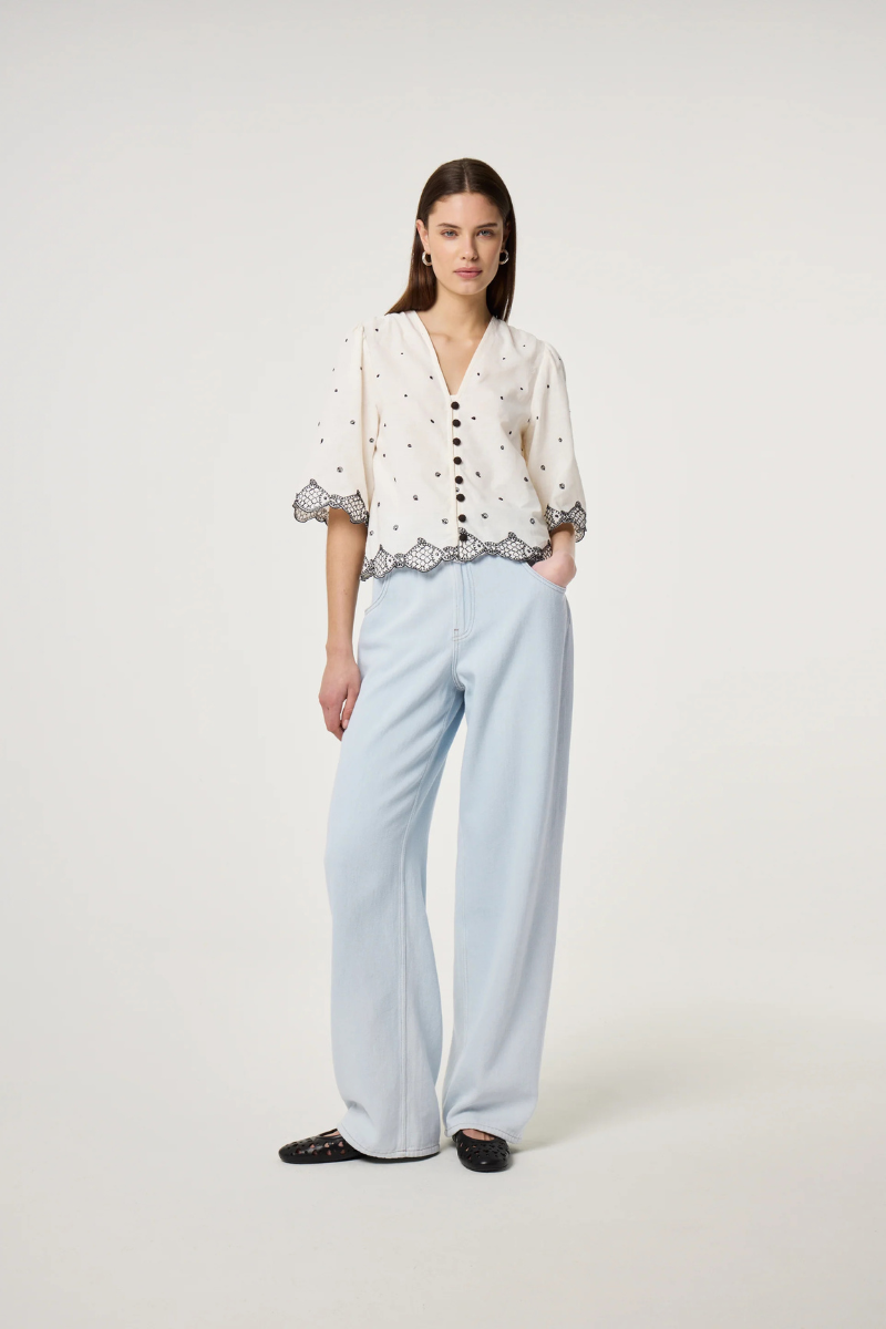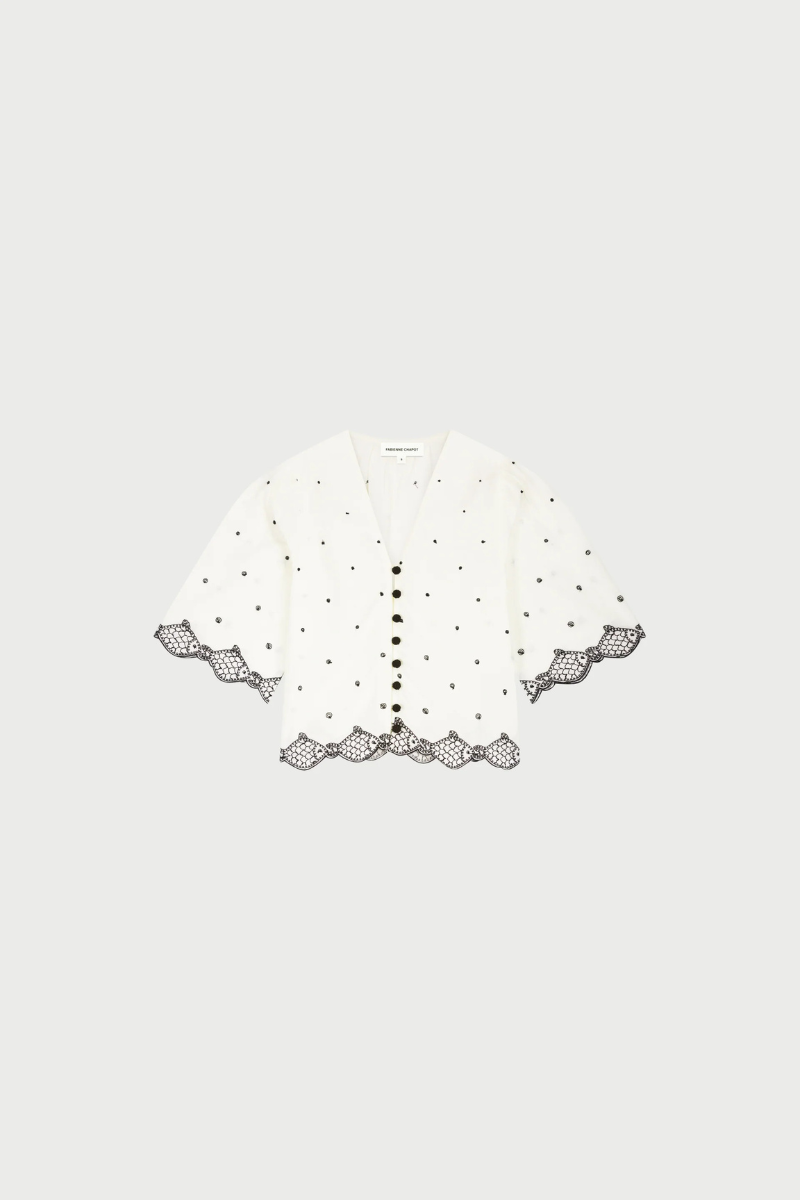 Αυτή η κομψή λευκή μπλούζα διαθέτει λεπτό μαύρο κέντημα και κυματιστό στρίφωμα με σχέδιο ψαριού, καθιστώντας την μια ξεχωριστή επιλογή για ένα δείπνο με ηλιοβασίλεμα ή μια ξεχωριστή γιορτή. Το ελαφρύ ύφασμα και η λαιμόκοψη V προσφέρουν μια κολακευτική, θηλυκή εφαρμογή που παραμένει άνετη καθ’ όλη τη διάρκεια του βράδυ. Συνδυάστε την με παντελόνι με ψηλή μέση για μια εκλεπτυσμένη βραδινή εμφάνιση ή συνδυάστε την με μια κομψή φούστα για ένα εκλεπτυσμένο και κομψό ντύσιμο.