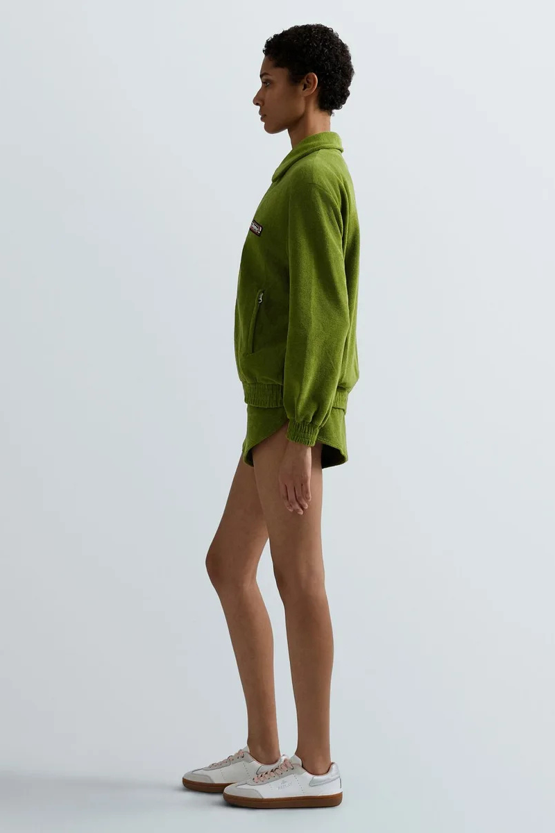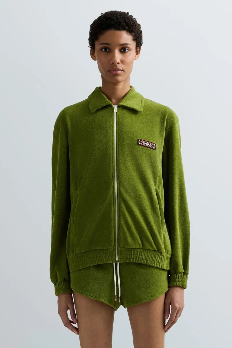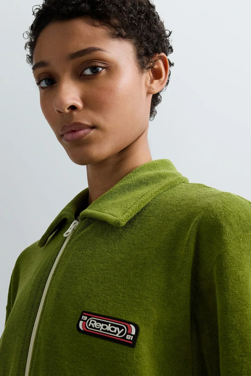 Φούτερ κανονικής εφαρμογής από ύφασμα πετσετέ με μείγμα βαμβακιού. Αυτό το στυλ διαθέτει φερμουάρ μπροστά, μυτερό γιακά τύπου πουκάμισου και ελαστικές μανσέτες και στρίφωμα. Το έμπλαστρο με το λογότυπο στο στήθος ολοκληρώνει το σχέδιο.