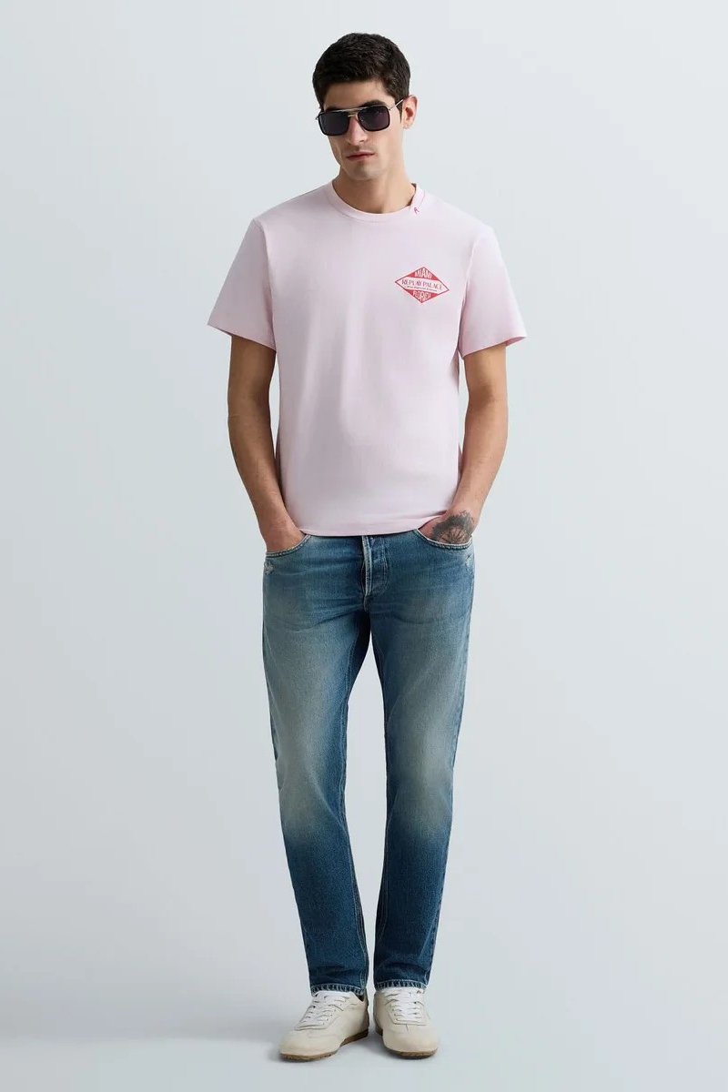Μπλούζα κανονικής εφαρμογής με στρογγυλή λαιμόκοψη από δροσερό, καθαρό βαμβακερό ζέρσεϊ. Αυτό το κοντομάνικο στυλ διαθέτει μια μικρή στάμπα στο στήθος που θυμίζει το λογότυπο με διαμάντια και γράμματα αφιερωμένα στο Μαϊάμι, το οποίο εμφανίζεται σε μάξι μέγεθος στο πίσω μέρος. Αυτό το στυλ ολοκληρώνεται με το εμβληματικό κόκκινο κέντημα R στο λαιμό.